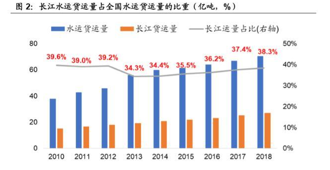 长江货运量全国第一,推动长江经济带发展。长江货运量从 2010 年的 15.02 亿 吨增长到 2018 年的 26.90 亿吨,年均复合增速 7.56%,占全国水运货运量的比 例一直在 30%以上,位居全国第一。2018 年长江干线货运量达到 26.9 亿吨, 占全国水运货运量的 38.3%。长江经济带的航运具有运输成本低、运输能力大、 占地少、能耗低、污染小等特点,依托黄金水道,推动长江经济带发展,促进区 域经济协同发展。