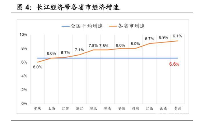 长江流域区域经济发达。2018 年长江经济带 GDP 40.30 万亿元,占全国 GDP 总量的 44.76%。11 个省市除重庆市以外,GDP 增幅均高于全国水平 6.6%,其 中贵州省和云南省的增长率达到 9%左右。