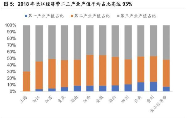 二三产业产值平均占比 93%。长江流域目前已成为我国农业、工业、商业等方 面最发达的地区之一,也是全国除沿海开放地区以外,经济密度最大的经济地带。 其产业结构持续优化,2018 年长江经济带二三产业产值平均占比高达 93%。