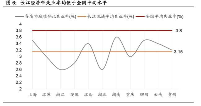 长江流域社会发展水平较高。截至 2018 年底,长江流域 11 个省市共有常住人 口 5.99 亿,占全国总人口 42.91%。与此同时,长江经济带在就业水平、科技 创新、医疗保障、科教水平等多个方面拥有不凡的表现。长江经济带 11 个省市 失业率均低于全国平均水平,就业人员占全国就业人员比重为 42.1%,而失业 人数占比仅为 33.9%。