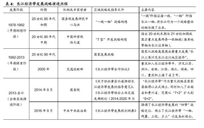 长江经济带的概念源来已久,长江流域的开发和保护经历了漫长的探索过程。20 世纪 80 年代,长江沿岸轴总体上仍处于自我发展阶段,长江沿岸轴的开放开发 仍停留在规划构想阶段。90 年代中期,“长三角和沿江地区”的发展首次上升为 国家级战略,这一阶段以上海浦东开发开放为龙头与核心。