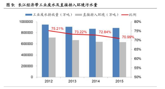 长江沿岸分布着 40 多万家化工企业、五大钢铁基地、七大炼油厂等,面临着严 重的“重化工围江”问题,这些重化工企业产生的大量的工业废水未经处理就直 接排入长江,导致长江水污染情况日趋严重。2012 年长江经济带工业废水排放 量94.85亿吨,其中直接排入环境的污水量有71.33亿吨,直排占比高达75.21%, 近些年随着环保重视程度的提高,工业废水排放量和直排占比有轻微的下降趋势, 但绝对值依然很高。