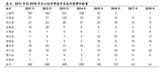 近些年来,长江经济带环境污染事件频发:2011 年到 2013 年,长江经济带 11 个省市城市突发环境事件数量一直处于加速上升趋势,到 2013 年更是达到峰值 459 件。2014 年以后,随着国家对环保的重视,出台了一系列环境保护政策, 突发环境事件数量开始逐渐减少,但每年仍然有近百件突发环境污染事件。