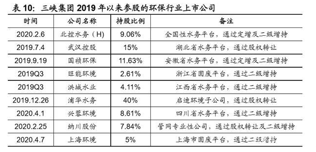 3) “资本+”参股多家上市公司。三峡集团围绕公司战略布局和能力培育方向, 以“资本先行参与进入,业务项目同步策划落地”为指导,通过资本投资方 式重点与污水运营、管网、污泥(协同餐厨)等方向的上市公司进行股权合 作。三峡集团以股权合作带动业务合作、技术引进和人才培养,完成长江大 保护的治理任务,被投资企业也能新增业务资源、提升市场影响力,达到双 赢的效果。除了原来控股或参股的长江电力、湖北能源、金风科技等上市公 司外,2019 年以来,三峡集团通过直接或者间接的方式参股了 9 家环保行 业上市公司,其中 6 家水务企业,2 家固废业务,1 家管网企业,预计未来 还将围绕长江治理的需求参股更多上市公司。