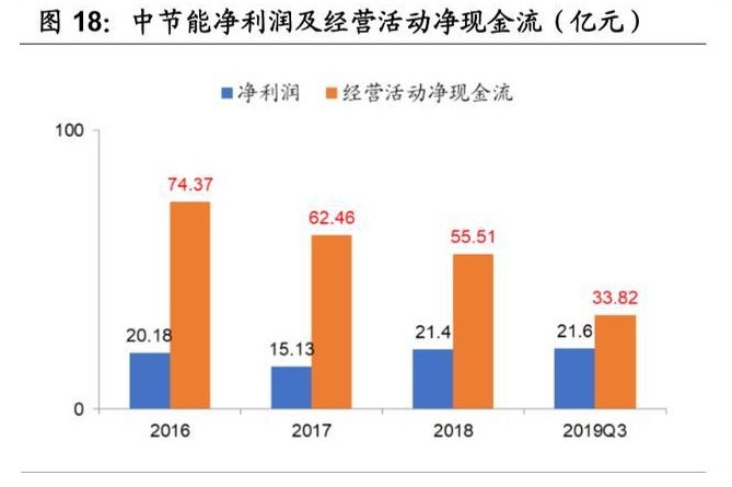 3)中节能的财务状况虽然相比三峡集团弱一些,但其绝对值依然较高,仍然有 能力也有责任在长江大保护中贡献一份力量。截止 2019Q3,中节能总资产 1622.32 亿元,净资产 488.87 亿元,净利润 21.60 亿元,经营活动净现金流 33.82 亿元,资产负债率 69.87%。