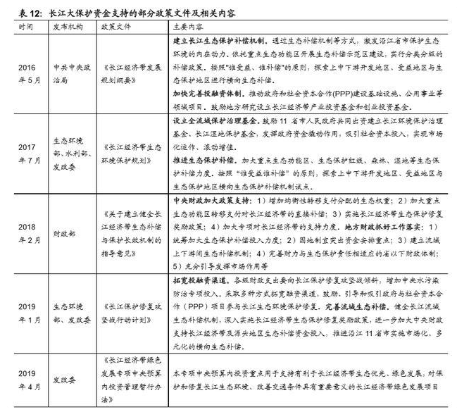 国家政策:各部委下发的政策中基本上都从加大财政支出、完善投融资、建立生 态补偿机制等角度给予了支持。其中《长江经济带发展规划纲要》中明确提出要 建立长江生态保护补偿机制以及加快完善投融资体制;《长江保护修复攻坚战行动计划》也指出:1)各级财政支出要向长江保护修复攻坚战倾斜,增加中央水 污染防治专项投入。2)采取多种方式拓宽融资渠道,鼓励、引导和吸引政府与 社会资本合作(PPP)项目参与长江生态环境保护修复;3)健全长江流域生态 补偿机制,进一步加大中央财政支持长江经济带及源头地区生态补偿资金投入, 推进沿江 11 省市实施市场化、多元化的横向生态补偿。