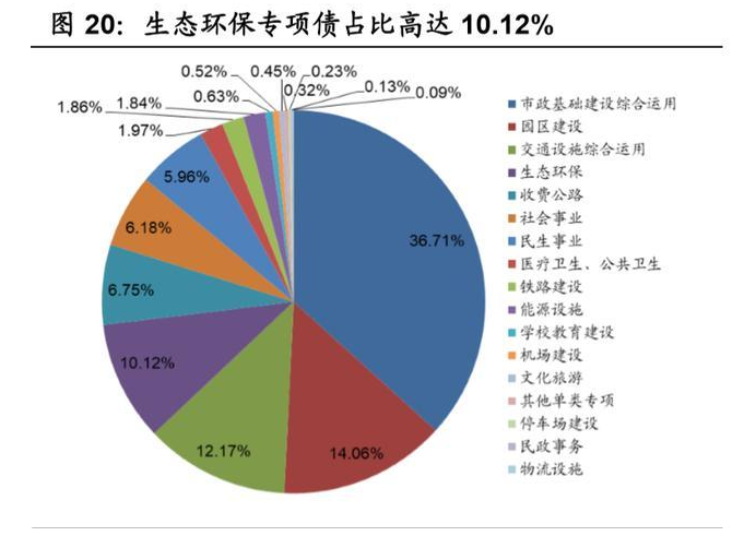 地方政府:生态环保类专项债投资比重有所加大。2020 年以来(截至 4 月 30 日)31 省市提前批累计新增地方政府专项债 11586.72 亿元,其中生态环保类专项债 1189.72 亿元,生态环保类专项债占比高达 10.12%,远远超过 2019 年全 年生态环保专项债总计发行 531.24 亿元,生态环保专项债占比仅为 2.44%,政 府专项债对生态环保的倾斜力度有所加大。长江经济带 9 省 2 市专项债合计 4601.55 亿元,占比 39.71%,将会助推长江大保护的稳步发展。