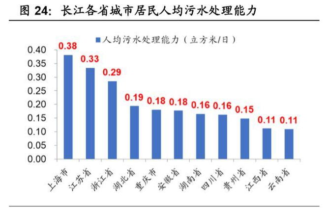 我们根据各省的污水处理能力及城镇人口计算出各省的人均污水处理能力,其中 上海、江苏、浙江因为经济相对发达,人均污水处理能力较高,分别为 0.38/0.33/0.29 立方米/日,江西、云南最低,均为 0.11 立方米/日。