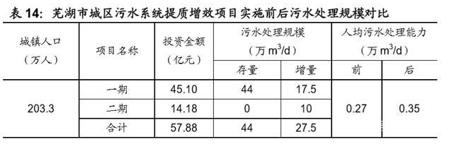 芜湖市作为长江大保护第一批 4 个试点示范城市之一,目前水环境综合治理正在 稳步推进中,我们根据芜湖市城区污水系统提质增效 PPP 项目一二期的招标公 告信息,一二期的总投资额分别为 45.10/14.18 亿元,新增污水处理规模分别为 17.5/10万m3/d,两期项目完成后,芜湖市的污水处理能力将由目前的44万m3/d 提升到 71.5m3/d,根据现有城镇人口约 203.3 万人计算,人均的污水处理能力 从 0.27 m3/d 提高到 0.35 m3/d。