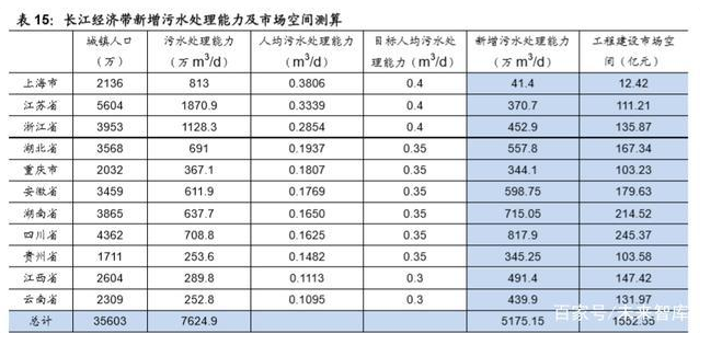 我们认为经过长江大保护之后,沿江各省市的污水处理能力将会得到提升,按照 人均污水处理能力来推算长江经济带各省市的新增污水处理市场规模,结合芜湖 市的数据,我们假设经济较发达的上海、江苏和浙江三省达到 0.4 m3/d,江西、 云南两省为 0.3 m3/d,其余省份为 0.35 m3/d,以此来测算出各省市的新增污水 处理规模,并根据新建污水处理厂单吨 3000 元(出水标准一级 A)来计算市场 空间。