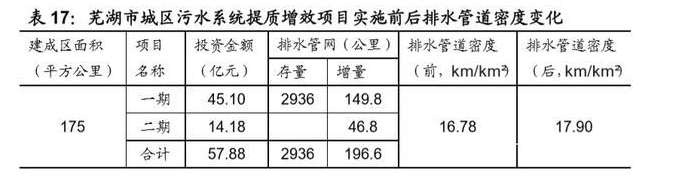 我们根据城市排水管道密度(管道总长度/建成区面积)来测算长江经济带排水 管网的市场空间。我们根据芜湖市城区污水系统提质增效项目的数据,芜湖市建 成区管网密度从实施前的 16.78 公里/平方公里提升到实施后的 17.90 公里/平方 公里。