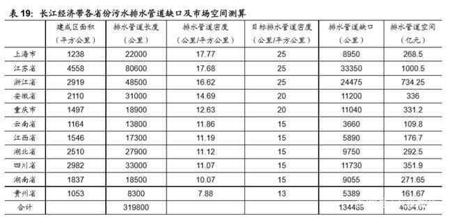 我们搜集多个污水管网建设工程项目合同计算出单位公里管网建设投资约为 328 万元,因此假设单位公里管网建设投资为 300 万元,可以粗略计算出长江 经济带各省份潜在污水排水管道缺口 13.45 万公里,投资金额约 4034.67 亿元。