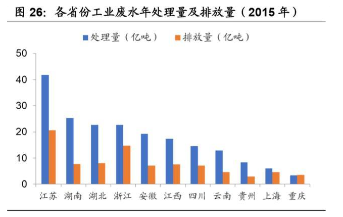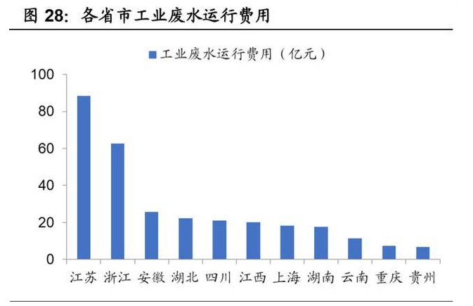 从各省的工业废水治理设施处理产能来看,江苏省的处理产能最高,达到 2009 万吨/日,重庆最低为 245 万吨/日,我们以一年 365 天计算,并结合各省份的年 工业废水处理量,算出各省份的产能利用率,云南省以 65.12%位居第一,9 省 2 市的工业废水处理设施产能利用率平均仅为 51.26%,有仅一般产能处于闲置 状态。而运维费用方面,2015 年 9 省 2 市的运维费用总和为 301.87 亿元,其中江苏省最高,为 88.30 亿元。