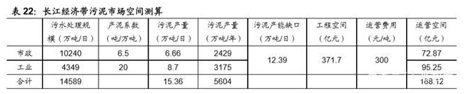 综合以上分析,长江经济带市政+工业污泥的处理总规模将达到 15.36 万吨/日, 根据 E20 数据,2018 年全国已运营污泥项目总规模为 7.42 万吨/日,由于无法 获取各省的详细数据,我们假设长江经济带占比 40%,则有 2.97 万吨/日,对应 污泥处置产能缺口高达 12.39 万吨/日,我们按工程建设投资 30 万/(吨/日)计 算,则污泥的工程建设投资将达 371.7 亿元。污泥运营部分我们按 300 元/吨计 算,则运营市场空间为 168.12 亿元/年。